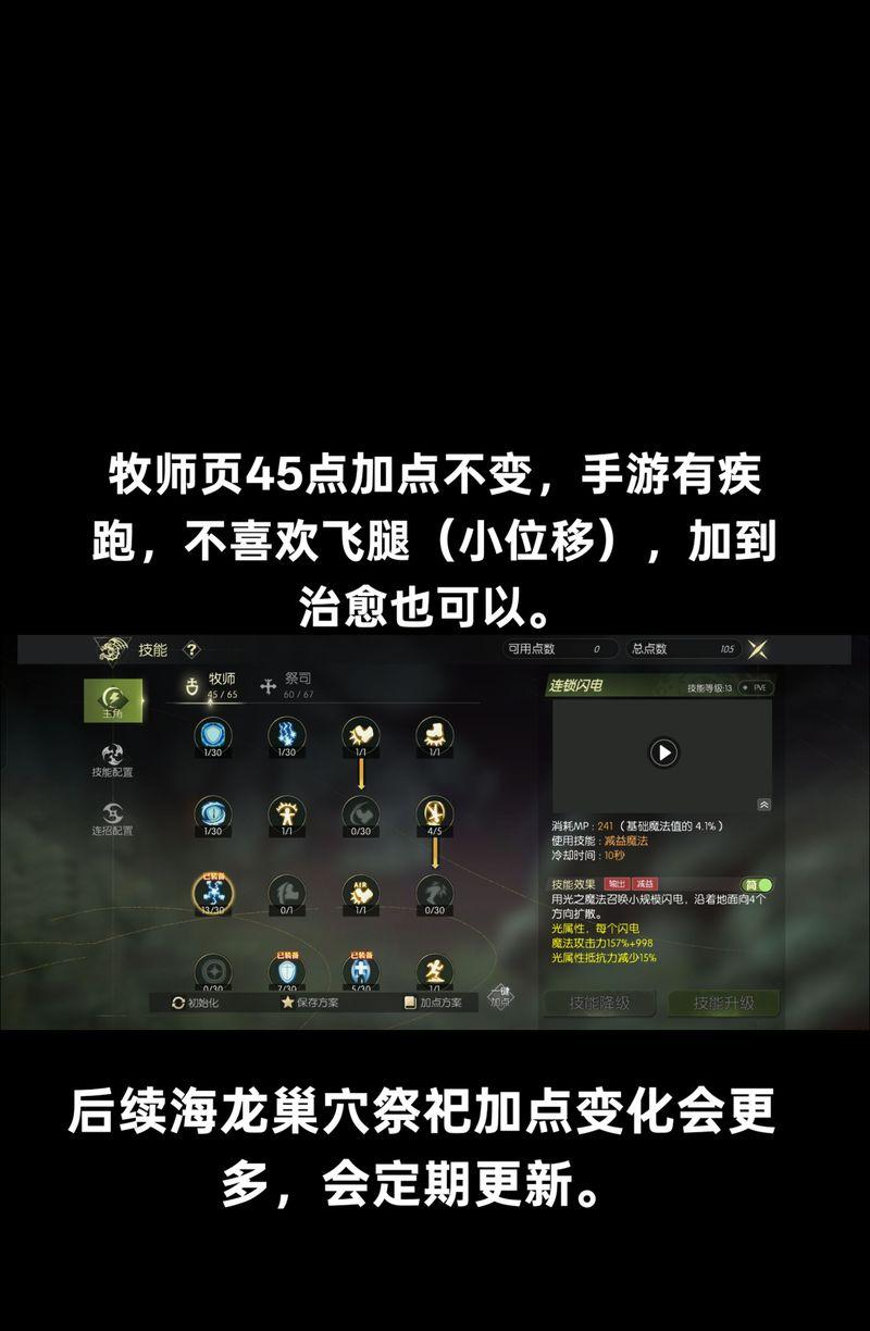 牧师职业是游戏中的治疗和辅助角色,因此在技能加点上应注重提升治疗和恢复能力。此外,牧师也可以投入一些增益技能,如增加队友属性或提高队伍士气,以提高整个团队的战斗力。
